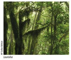 Mención especial merecen los bosques de laurisilva, localizados en las islas Canarias, salvo en las más áridas de Lanzarote y Fuerteventura. Su distribución se vincula a las vertientes medias orientadas al norte y noreste y a los vientos húmedos del alisio. Las principales especies arbóreas son el laurel (Laurus novocanariensis), el viñátigo (Persea indica), el barbusano (Persea barbujana) y el til (Ocotea foetens). Su dominio potencial se considera mucho más amplio que el actual (11,4% frente a menos de un 2% de la superficie que ocupa en nuestros días), y se asocia a suelos profundos y fértiles para la agricultura. El fayal-brezal corresponde principalmente a comunidades de sustitución integradas por brezo (en la cartografía Erica arborea según indica la fuente, y también presencia del endemismo Erica canariensis), faya (Myrica faya en la cartografía según indica la fuente, actualmente denominada Morella faya) y acebiño (Ilex canariensis), resultado del intenso uso agrario y forestal que ha experimentado el bosque hasta hace algunas décadas.
